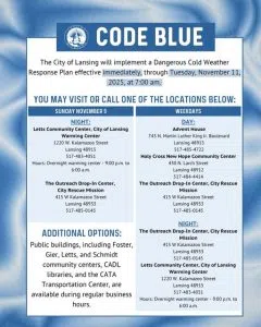 LANSING, MI -- Lansing officials have activated the city's Code Blue extreme weather plan. The Code Blue is in effect through...